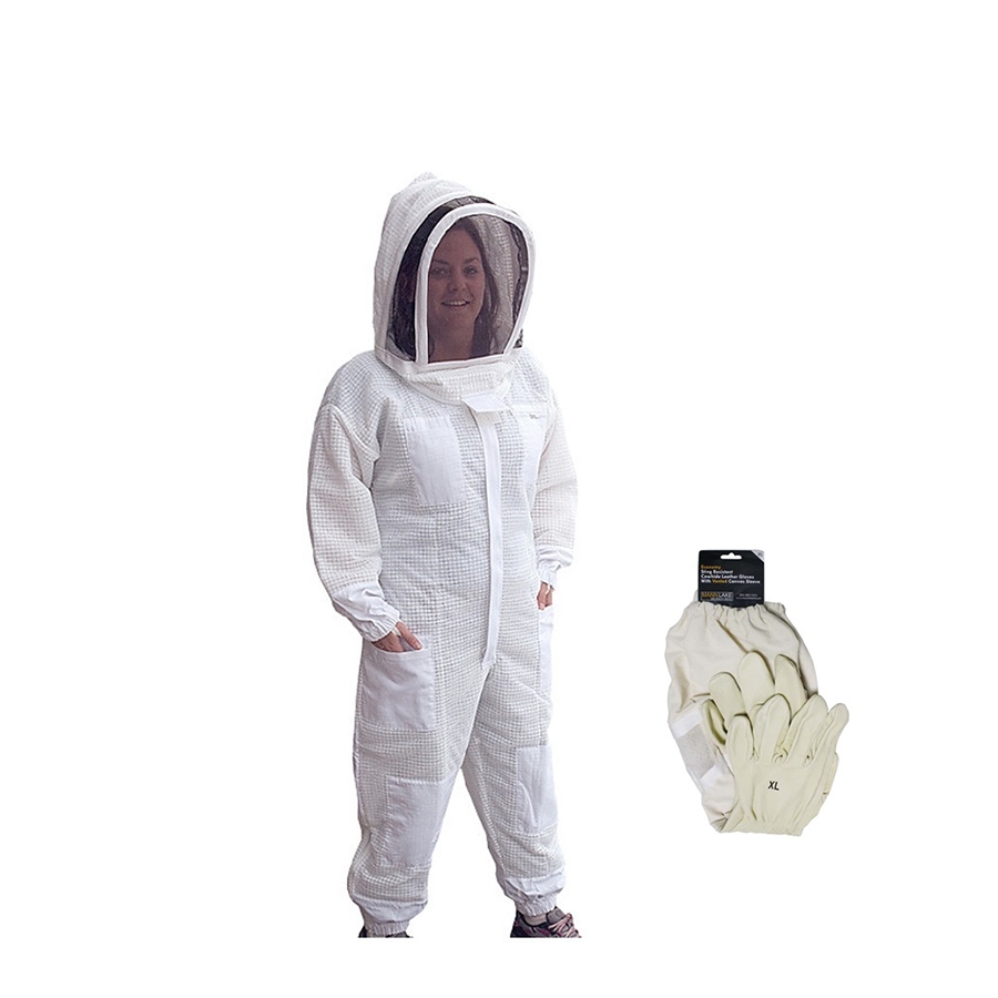 - Traje de abeja ventilado ideal para climas calurosos. Una capa de malla de goma se encuentra entre dos capas de malla de tejido fino.