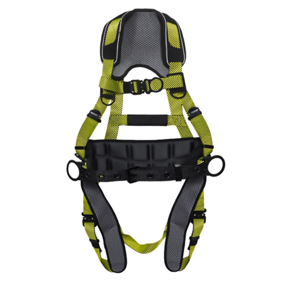 - Este arnés de cuerpo entero Vangard con cinturón lumbar, de diseño en H, es ajustable en 6 puntos y cuenta con almohadillas en cintura, piernas y hombros para aumentar la comodidad del usuario.