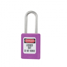 - Candado de seguridad Zenex™ en termoplástica púrpura de 1-3/8" (35 mm) de ancho y un arco de acero inoxidable de 1-1/2" (38 mm) de alto, con retención de llave.