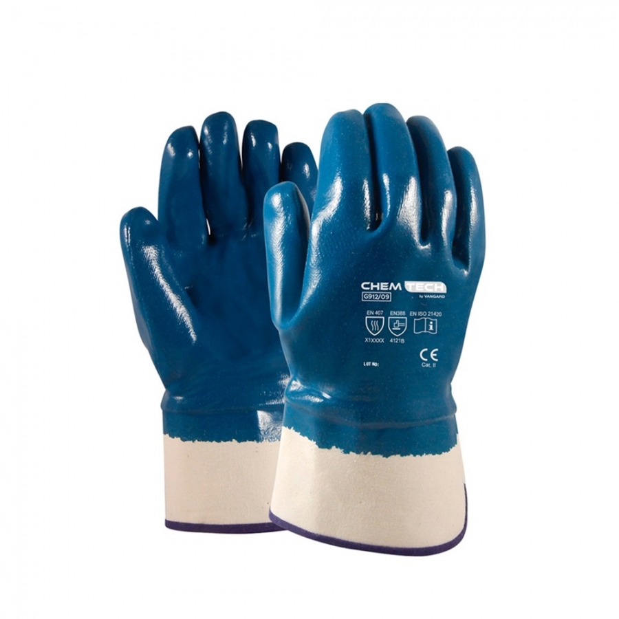 - Los guantes VANGARD de la línea CHEM TECH tienen un revestimiento pesado de nitrilo, con una excelente resistencia a la abrasión, además de una buena resistencia al calor por contacto y ligeros cortes. Brindan un buen agarre ideal para múltiples labores generales, su aplicación está prevista para línea de montaje, reparación de automóviles, reciclaje y similares.