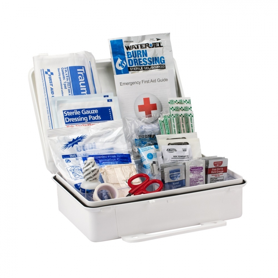 - Contiene amplia variedad de artículos de primeros auxilios básicos, entre ellos: bandas adhesivas, vendas, gasas, solución para lavado de ojos, crema para quemaduras, compresa fría instantánea, entre otros.
