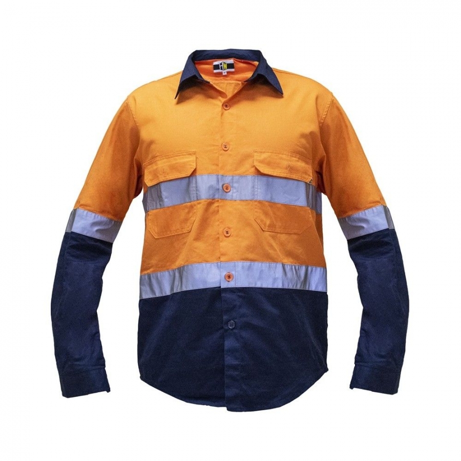 Camisa bicolor (azul/amarillo) 100% algodón con cinta reflectiva gris y ventilación