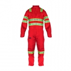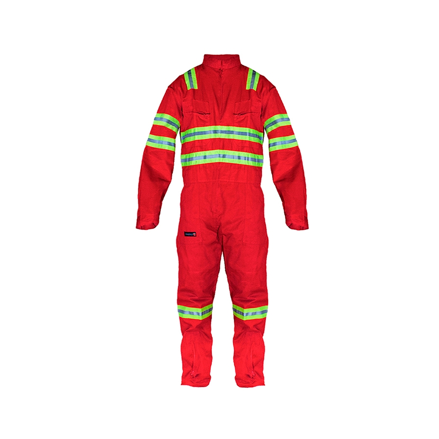 - Con cintas reflectivas para mayor seguridad en condiciones de poca luz. La cinta es de 2.5" Bi-Color (verde/gris) en pecho, espalda y alrededor de piernas y brazos.