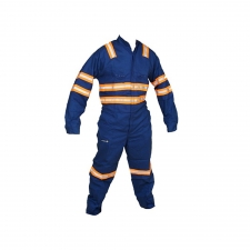 Con cintas reflectivas para mayor seguridad en condiciones de poca luz. La cinta es de 2.5" Bi-Color (naranja/gris) en pecho, espalda y alrededor de piernas y brazos.